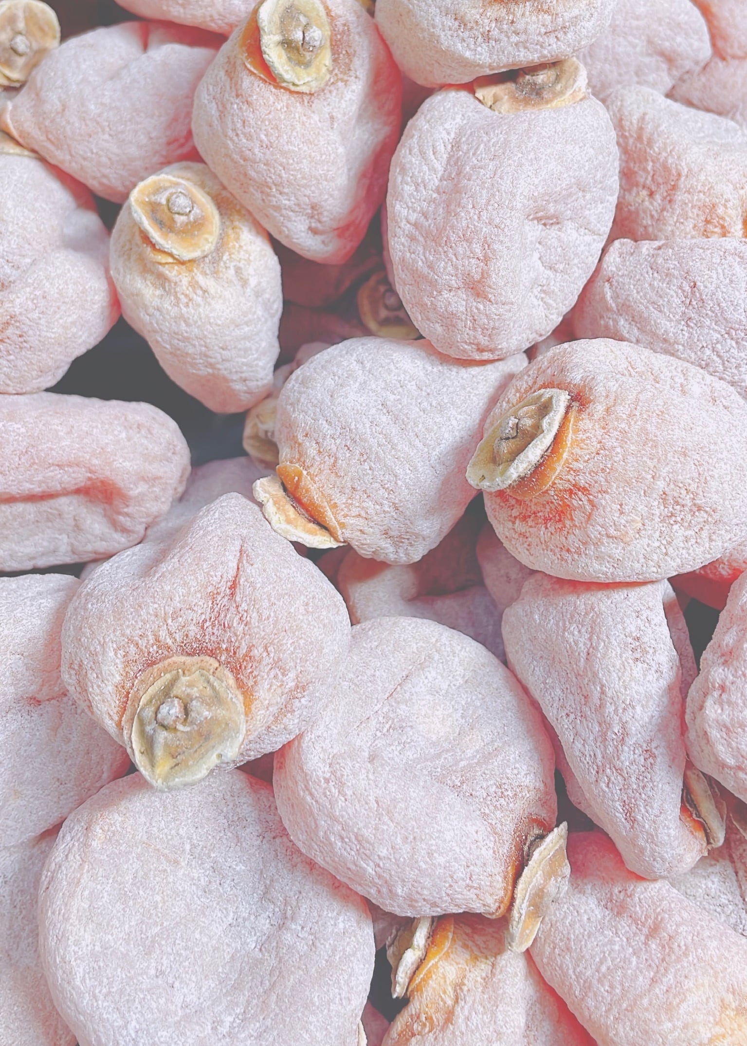 柿が纏う美しくきめ細かな白いお粉は「柿霜(しそう)」と呼ばれる果糖の結晶です。手間をかけた市田柿ほど柿霜が深く降りつもり、ほどける口溶けと優しい甘みがお口いっぱいに広がります。また、黒点がある場合がありますが、抗酸化作用のある タンニンという成分です。いずれも品質に影響はありませんので安心してお召し上がり下さい。また、種が入っていることがあります、縦に割いてから食べることをおすすめします。